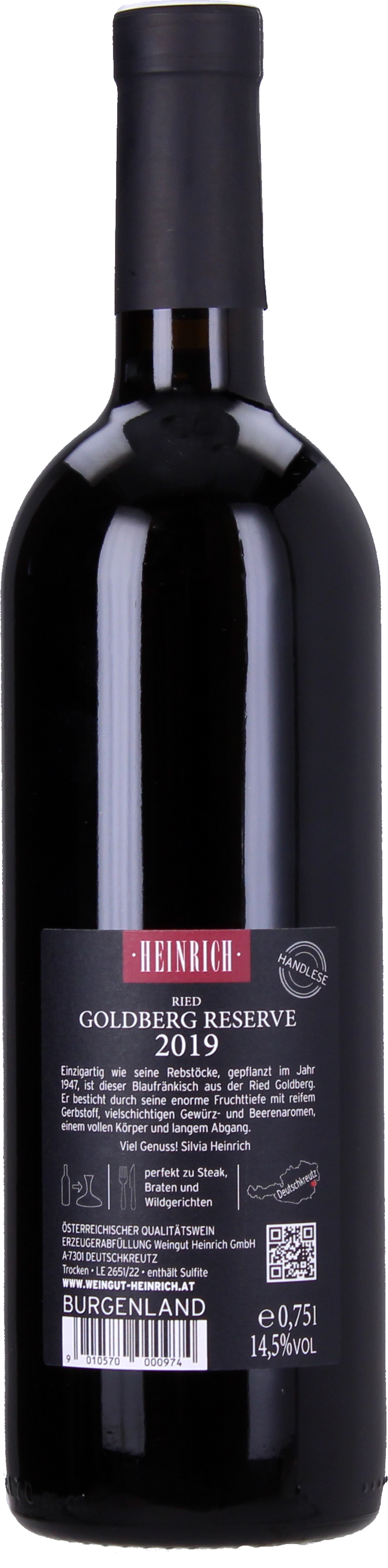 The vines for this wine were planted on the Goldberg vineyard in Deutschkreutz by the Heinrich family in 1947. The heavy, sandy loam soils and the warm Pannonian climate provide ideal conditions for the Blaufränkisch grape variety, which has been cultivated for centuries.
